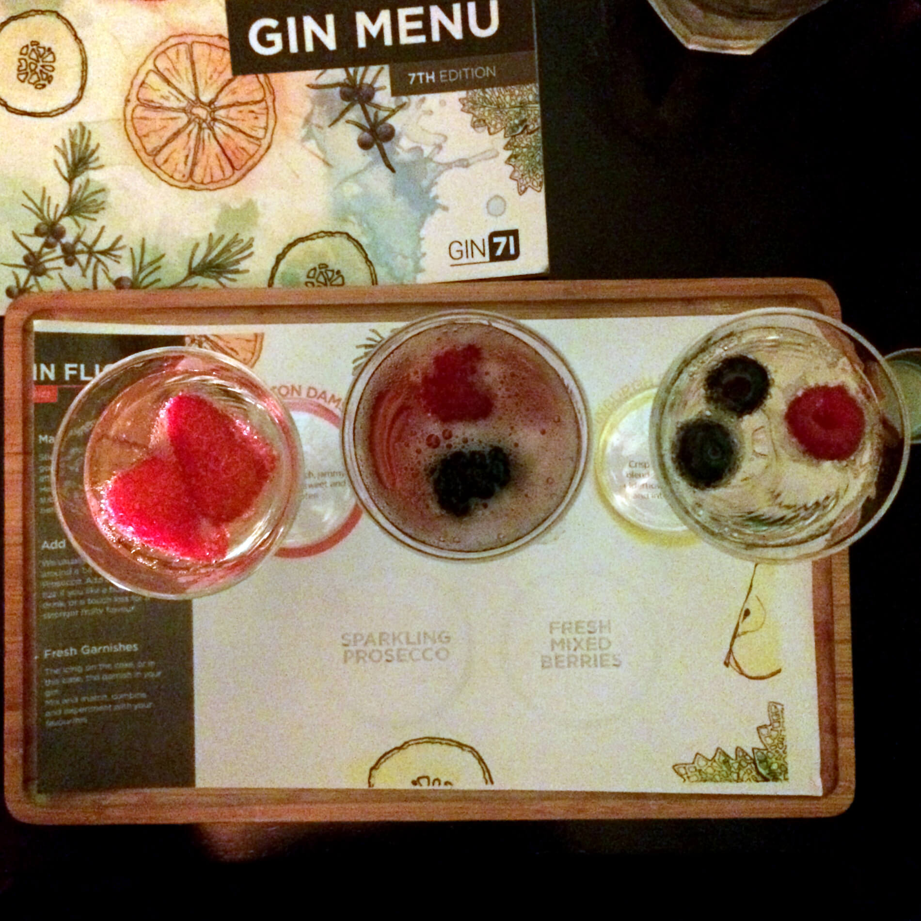 The cocktail menu is extensive and – perfect for indecisive people like me – they also offer “gin flights” which come with three different gins and a mixer, which you mix yourself at the table. I went for the Gin Fizz flight which came with a mini bottle of Prosecco and a pot of berries for fruity and delicious cocktails.